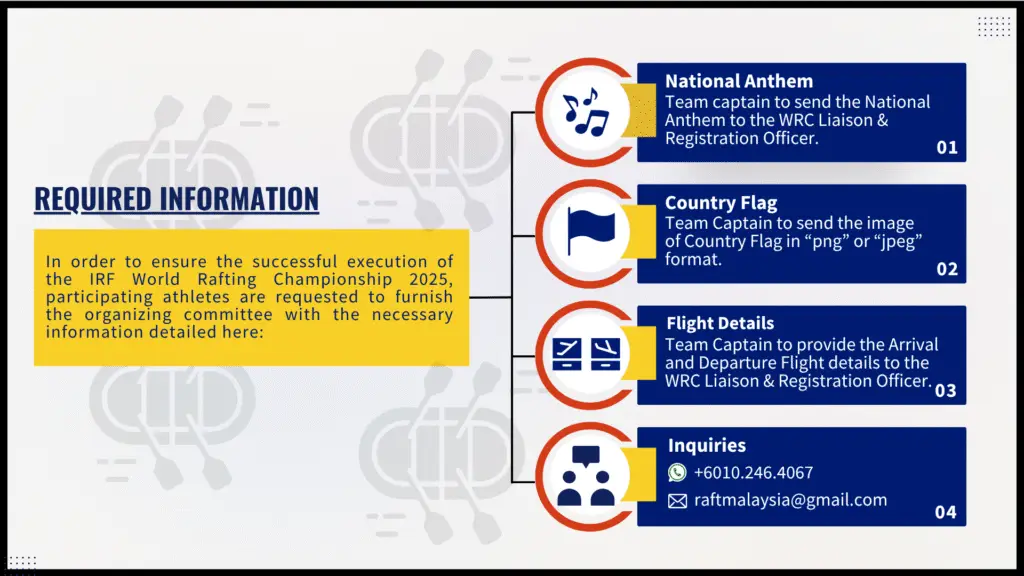 The organizing committee is dedicated to making your journey to and from the IRF World Rafting Championship as smooth as possible. We are providing scheduled airport transfers for all athletes and IRF Delegates. Our friendly team will be awaiting your arrival at Kuala Lumpur International Airport (KLIA) on November 27th and 28th 2025, ready to transport you comfortably to Gopeng. When it’s time to say goodbye, we will also have scheduled departures from Gopeng to KLIA on December 8th and 9th, 2025.
